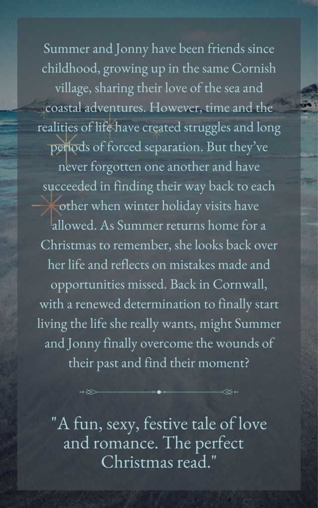 This festive story tells the tale of Summer and Jonny, friends since childhood, who have grown up in the same Cornish village, sharing a bond created over their love of the sea and coastal adventures. Time and the realities of life have created struggles and long periods of separation, but they’ve never forgotten one another and have succeeded in finding their way back to each other when winter holiday visits have allowed. As Summer returns home for Christmas, she looks back over her life and reflects on mistakes made and opportunities missed. She’s back in Cornwall with a renewed determination to finally start living the life she really wants, and we’ll follow her and Jonny to discover if they’ll finally overcome the wounds of their past and find their moment.